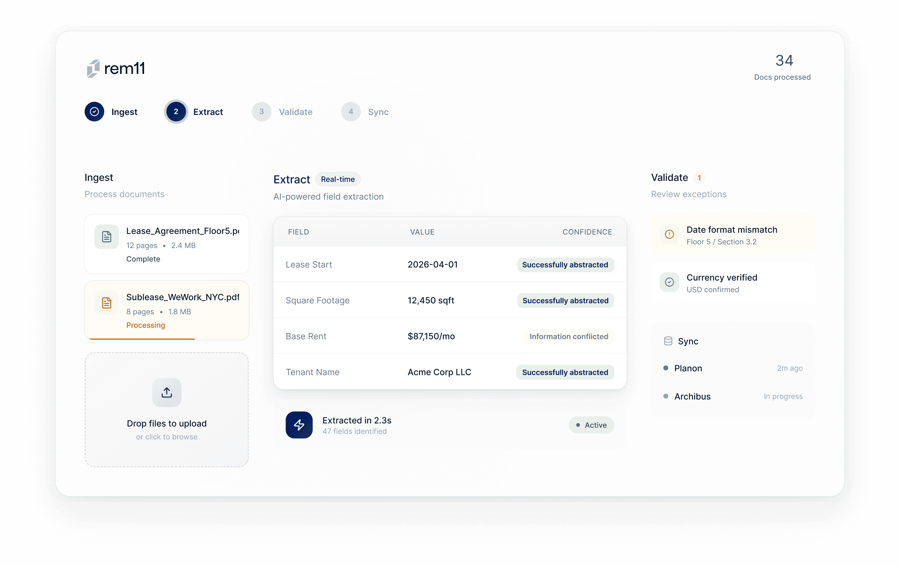 AI agents structure key fields, dates, rents, clauses, and asset data in seconds.